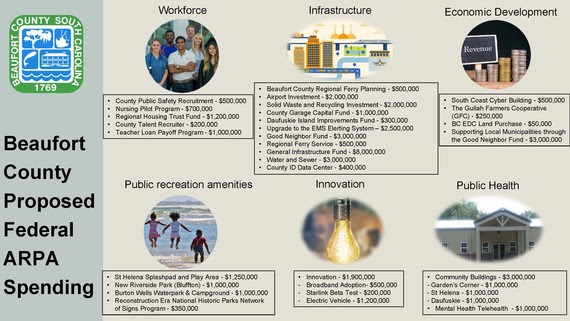 They include community and revenue-generating projects such as the construction of community buildings and ferry services to creating a park and splash pad on St. Helena Island and creating a water park and campground at Burton Wells Park similar to the popular water parks in Greenville and Charleston counties.