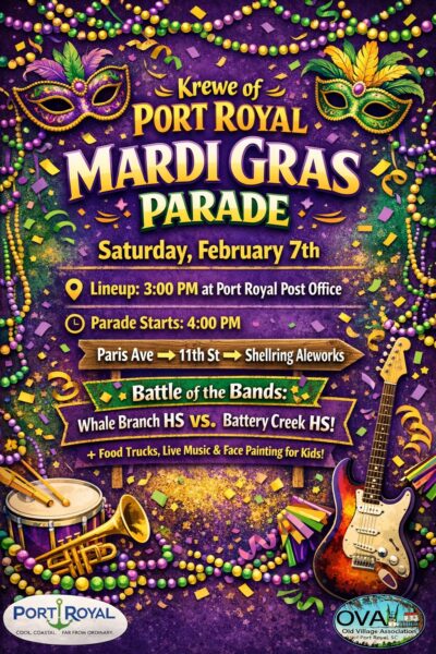 Come celebrate and let loose on Saturday, February 7th as The Town of Port Royal is turned into a lively festival of life, culture, and community; bringing the beads, music, floats, and all the excitement of Mardi Gras—Port Royal style.