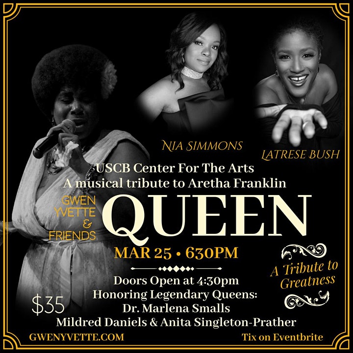 Gwen Yvette, joined by AMAZING artists, Nia Simmons and LaTrese Bush, will honor the Queen of Soul in a musical tribute on her 80th Birthday! We are taking time also to honor some LEGENDARY Queens in music and entertainment-Dr. Marlena Smalls, Mildred Daniels & Anita Singleton-Prather.