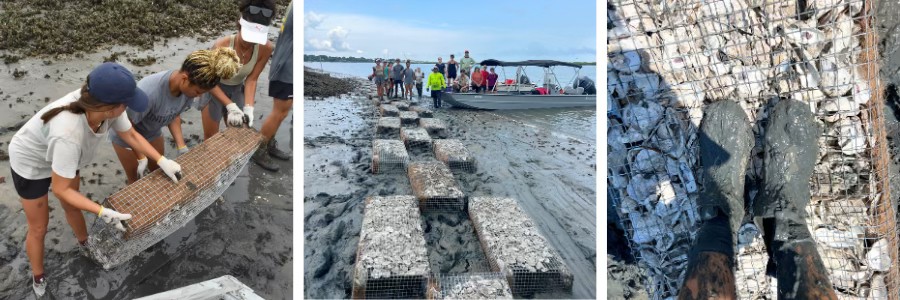 While reef builds are a blast, they are labor intensive! Expect to get muddy and wet, be in the sun, and get some exercise. Volunteers should be capable of and enjoy working in soft pluff mud while lifting and passing up to 40-pound bags of oyster shell and wire cages.