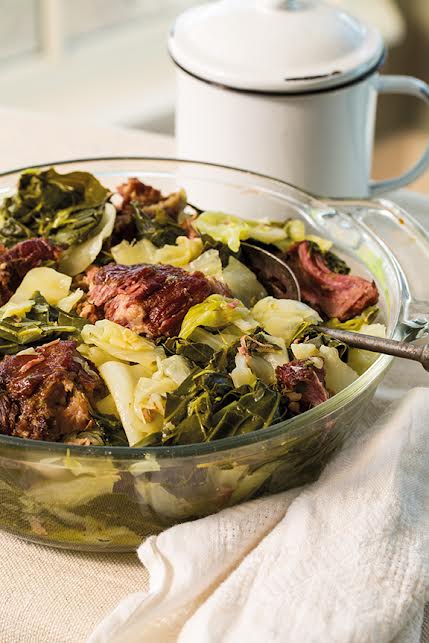 When the meat is almost tender, add the collards and the onion. Season with salt and pepper, decrease the heat to medium, cover, and simmer, stirring on occasion, for 1 hour. Next add the cabbage and more water if needed, and cook for 30 to 45 minutes, until the cabbage is as tender as you like it.