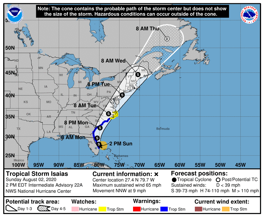 As of 2pm Sunday, the National Weather Service’s National Hurricane Center is reporting Isaias to be located 370 miles south-southeast of Savannah, moving north-northwest at 9 mph with maximum sustained winds of 65 mph. Updates from the National Hurricane Center can be accessed here.