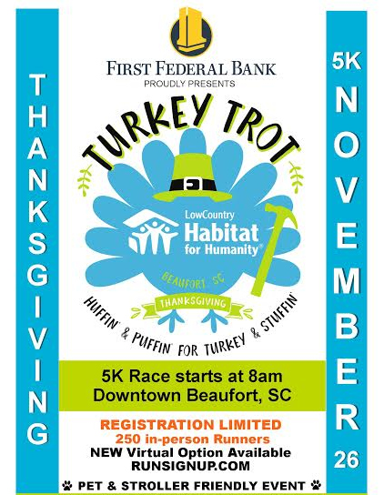 Runners can get excited that LowCountry Habitat for Humanity has announced they’re moving forward with the 3rd Annual Turkey Trot 5K in downtown Beaufort at 8am on Thanksgiving morning.
