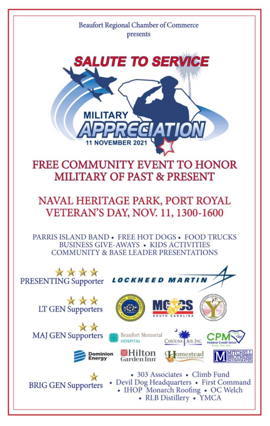 After the Veterans Day Parade, enjoy honoring all active-duty and retired veterans at the Salute to Service: Military Appreciation Day event at the Naval Heritage Park in Port Royal from 1pm to 5pm, organized by the Beaufort Regional Chamber of Commerce.