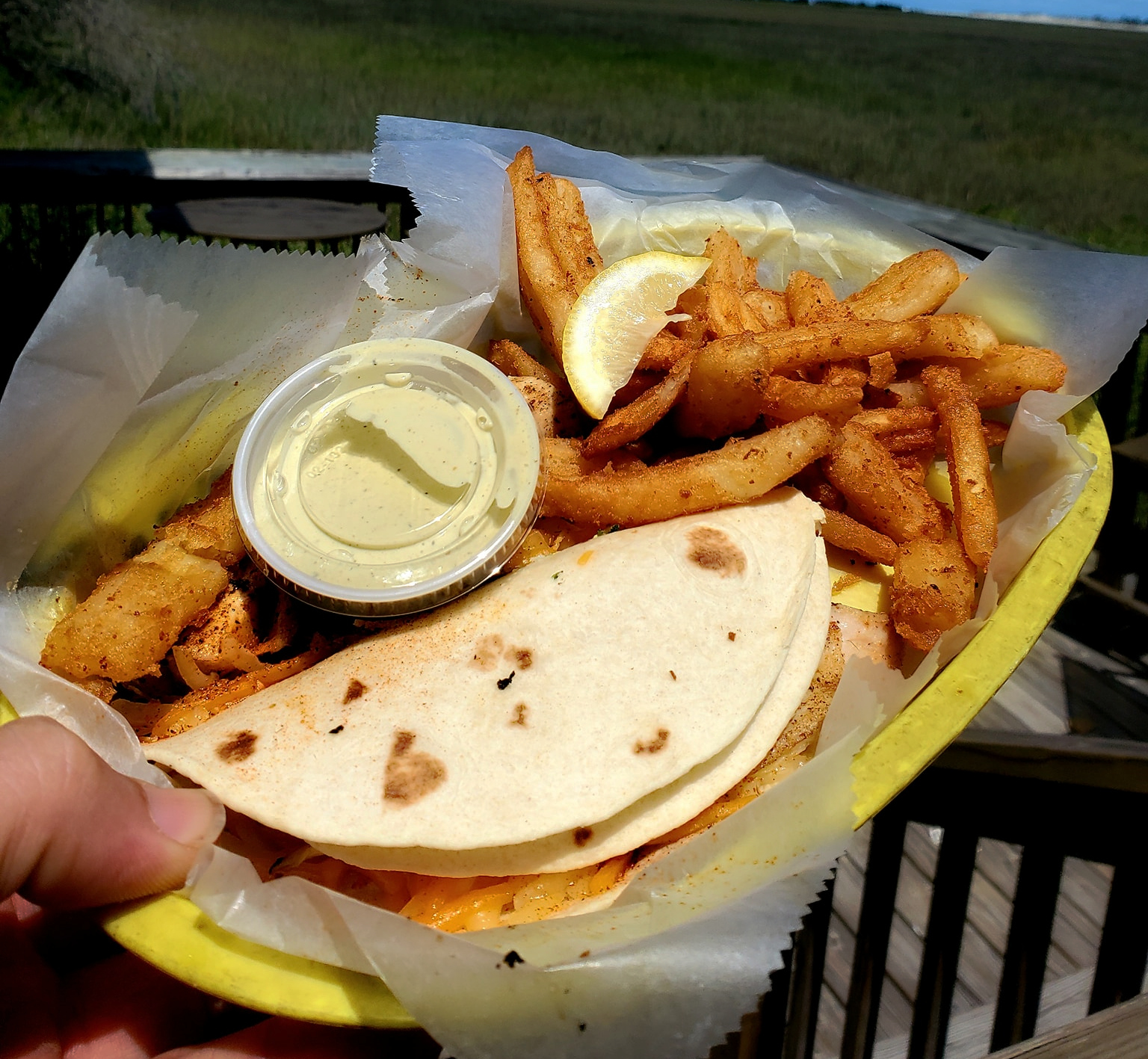 Tacos made the coastal way are a staple around the Beaufort SC area. Lots of restaurants serve them, but the best one of them all that we have found over the years is the fish taco at the Johnson Creek Tavern. Prepared using fresh mahi mahi, the fish is seasoned very well, blackened and then placed on a double tortilla with a layer of gooey cheese and some other goodies that blend very well together.