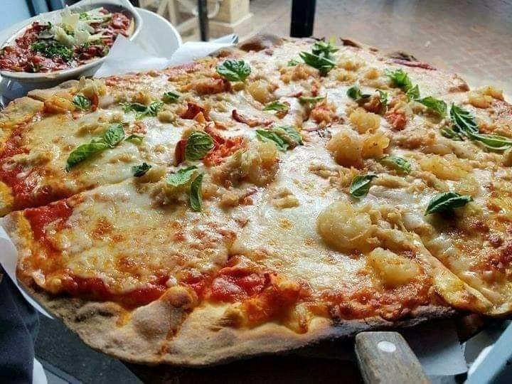 Yes, you can put seafood on a pizza, and there’s a really special one at Panini’s on the Waterfront. The “King Neptune” sits on their specialty pizza menu (on a part time basis) and is one of a kind. Topped with fresh local Beaufort shrimp, local crab which blend very well with mushrooms, fresh mozzarella cheese and their homemade tomato sauce. It’s not available all the time, but you’ll be happy when it is.